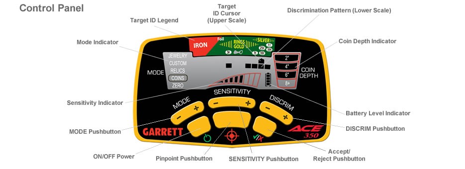• Search Modes (Discrimination Patterns): 5 plus electronic pinpointing •All Metal (Zero) •Jewelry •Custom •Relics •Coins •Pinpoint