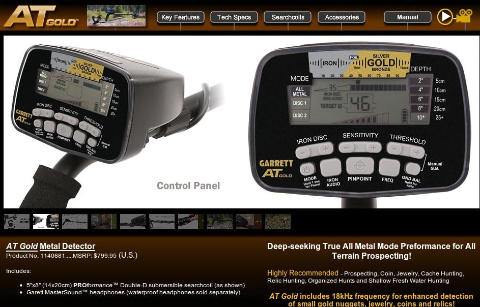 The Garrett AT Gold is a Motion All Metal detector, meaning that slight motion of the search coil is required to maintain detection, although static detection of targets can be achieved while in Pinpoint mode. The AT Gold includes manual and automatic Ground Balance plus an exclusive Ground Balance Window feature to optimize the detector’s performance in highly mineralized ground, where gold is most often found. This detector is also waterproof to a maximum depth of 10 feet (3 meters) for searching in freshwater lakes and streams.