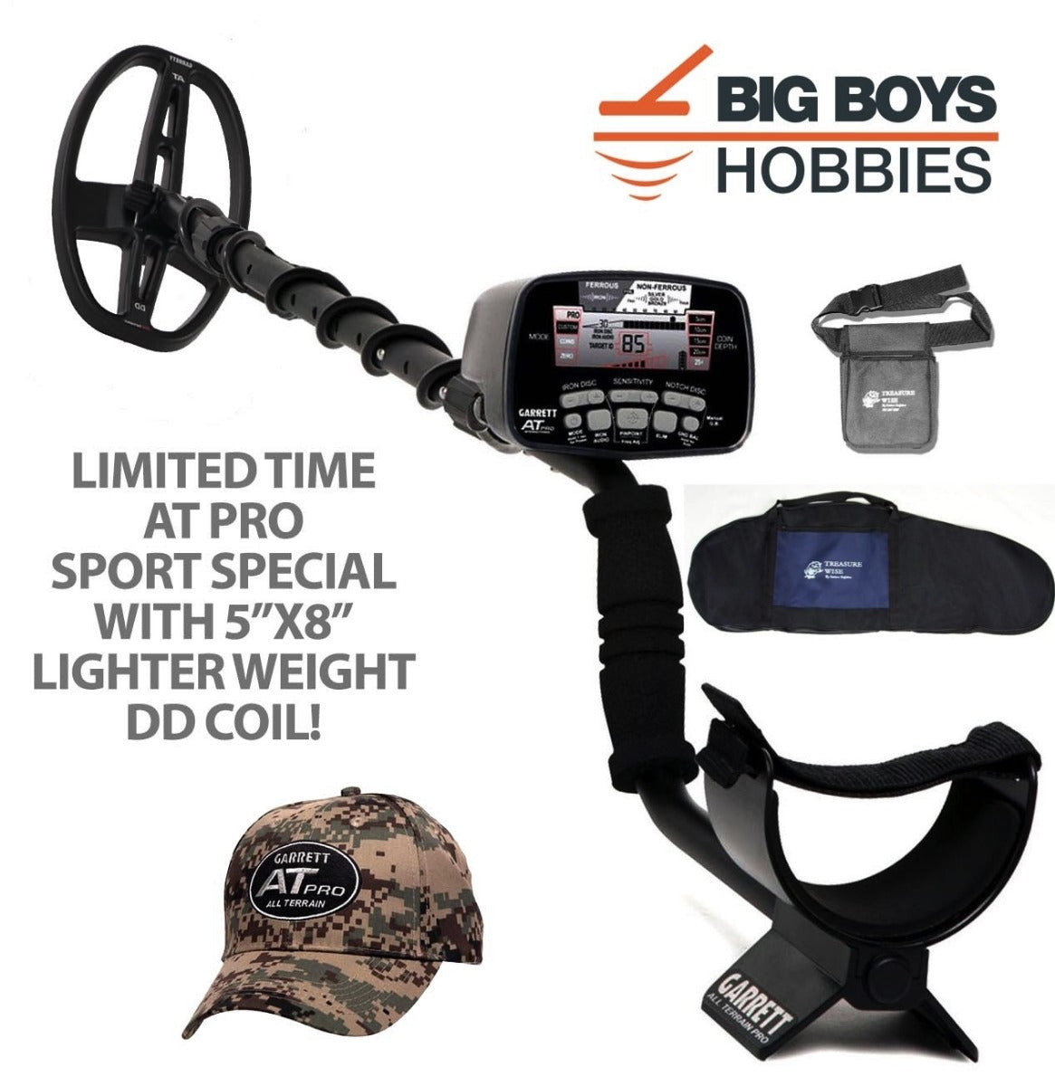 Same Garrett AT Pro but now available from BBH Metal detectors with a 5x8 Pro coil! Part # 1140461