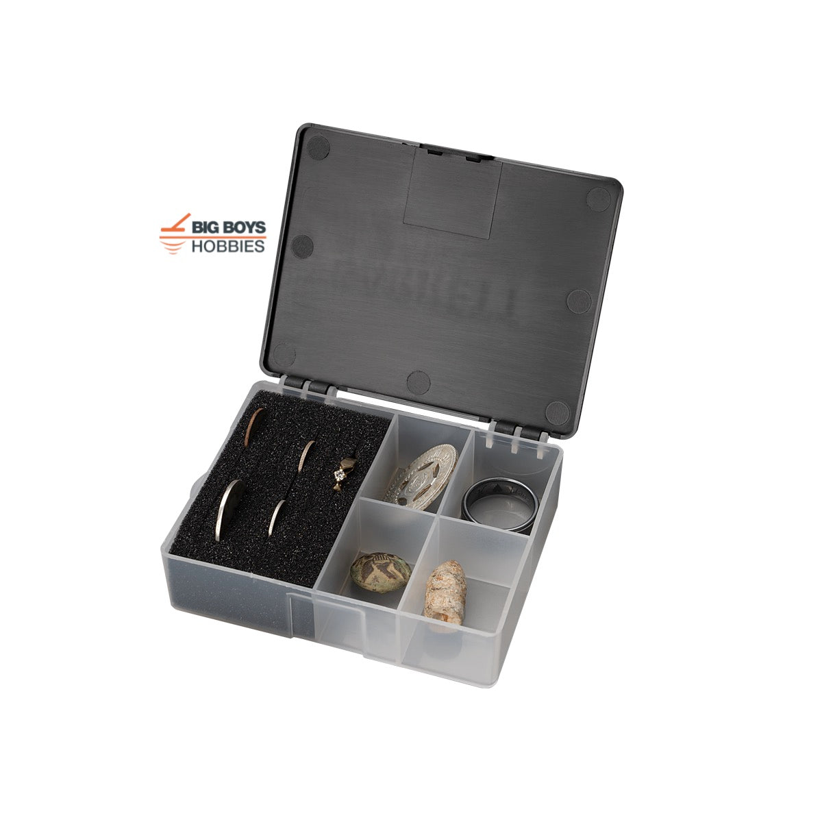Garrett double-sided Keepers finds box with multiple compartments.