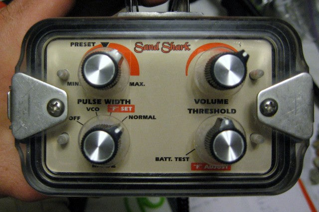Our new Sand Shark combines time-proven PI circuits with the latest digital technology creating the first microprocessor controlled PI detector for the new Millennium. Pulse Induction (PI) detectors have always been the natural choice for working wet salt beaches. Their circuitry and single loop coils will not see changes in salt-water conductivity that drive a VLF-style detector crazy. Add Tesoro Electronics' exclusive interchangeable Printed Spiral coils (available in two sizes) and you create a fantastic PI detector. But we didn't stop there. The Sand Shark has two distinct operating modes: VCO and Normal. When working in the VCO mode, as targets get closer to the coil, the threshold generates a louder, higher pitched tone great for pinpointing. The Normal mode works with a single tone and is used for beachcombing and other prolonged searches. We've added a microprocessor to help you customize the detector to your specific needs. Our Pulse Width control allows you to tune your detector to the best balance of depth, sensitivity, and battery life. You can also change the Normal mode audio frequency. Simply use the "F" Adjust knob to set the tone and you're ready to go. The Sand Shark also has a new drop-in battery compartment for quick and easy changes. The Tesoro Sand Shark will change the way that you think about pulse detectors. All Sand Shark Searchcoils are now Hardwired.