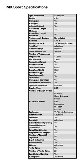 The MX Sport has a great set of target id tone discrimination options. The items noted below only indicate each target tone category and an item commonly found in that category. It does not mean that the tone will mean that exact item will be found.